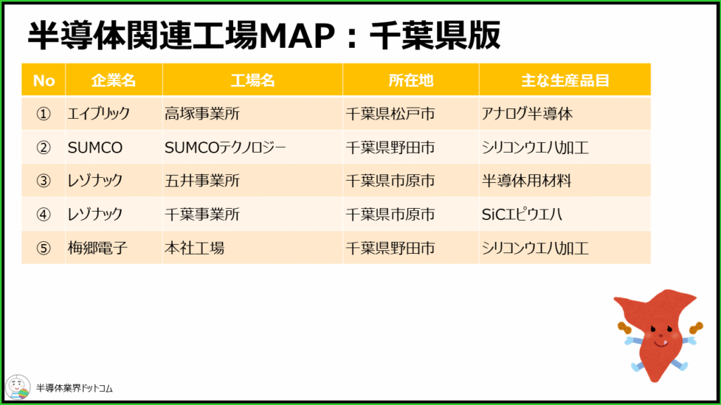 千葉県に立地している半導体関連工場を全部で5つ取り上げます。その一覧と、地図上のおおよその位置は上記の通りです。