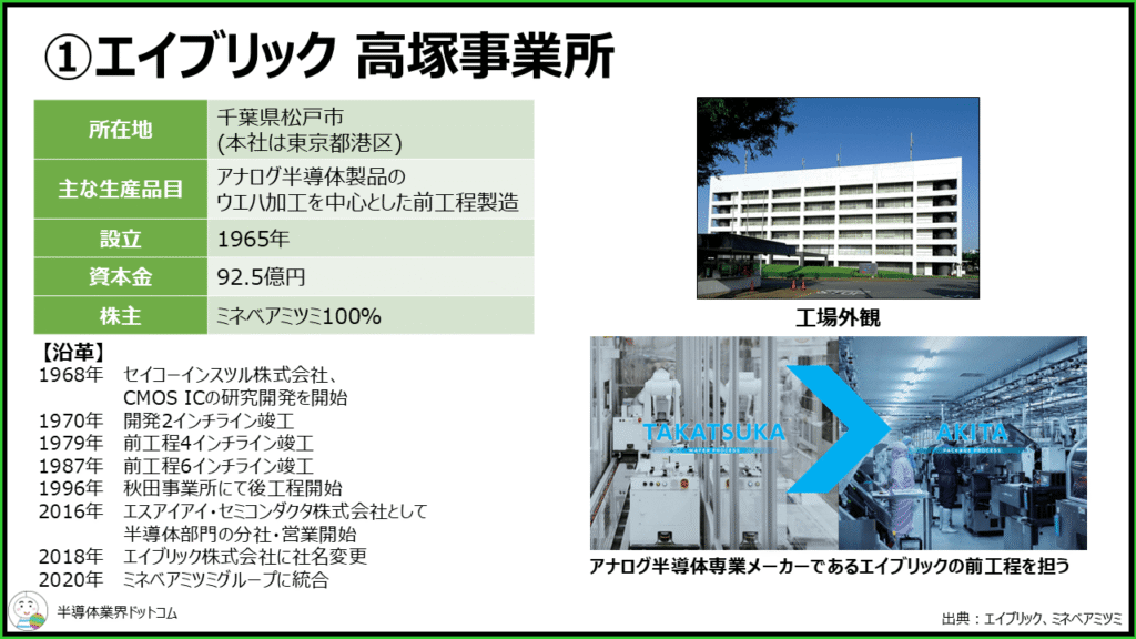 エイブリックはミネベアミツミグループでミネベアミツミの100%子会社です。エイブリックはアナログ半導体の専業メーカーで高塚事業所が前工程を担っており、秋田県大仙市にある秋田事業所が後工程工場となっています。