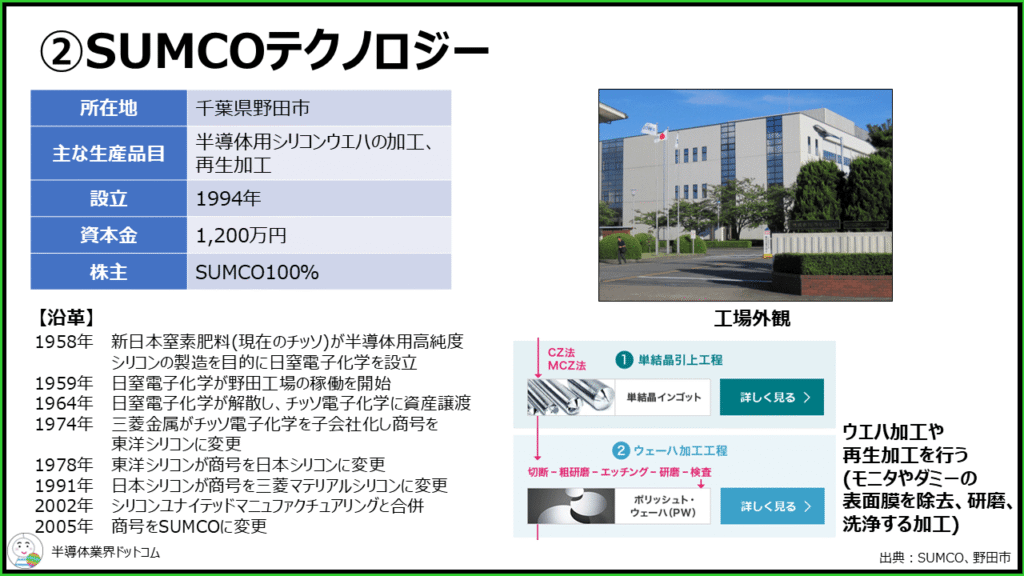 同社は社名の通りSUMCOの完全子会社です。ただ沿革は1958年の新日本窒素肥料(現在のチッソ)が半導体用高純度シリコン製造を目的に設立した日窒電子化学設立まで遡ります。1959年に日窒電子化学が野田工場の稼働を開始しています。その後は複数にわたる商号変更や合併などを経て2005年にSUMCOとなっています。