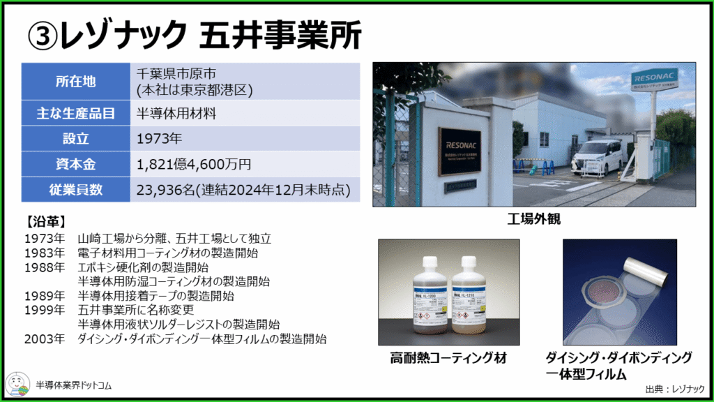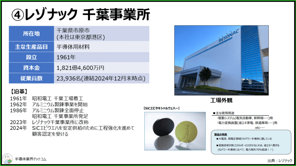 工場の歴史としては1960年代に昭和電工のアルミニウム製錬事業が開始さています。2023年に現在のレゾナック千葉事業所に改称され、2024年からSiCエピタキシャルウエハの安定供給のために工程強化を進め、顧客の認定を受けたということのようです。
