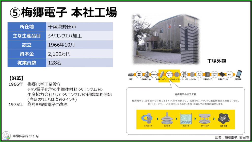 同社は1966年に梅郷化学工業として設立されています。既出のSUMCOテクノロジーのシリコンウエハ生産協力会社としてシリコンウエハの研磨業務を開始したということです。この当時のウエハ口径は2インチだったということで時代の流れを感じるサイズ感ですね。1975年に商号を現在の梅郷電子に変更しています。