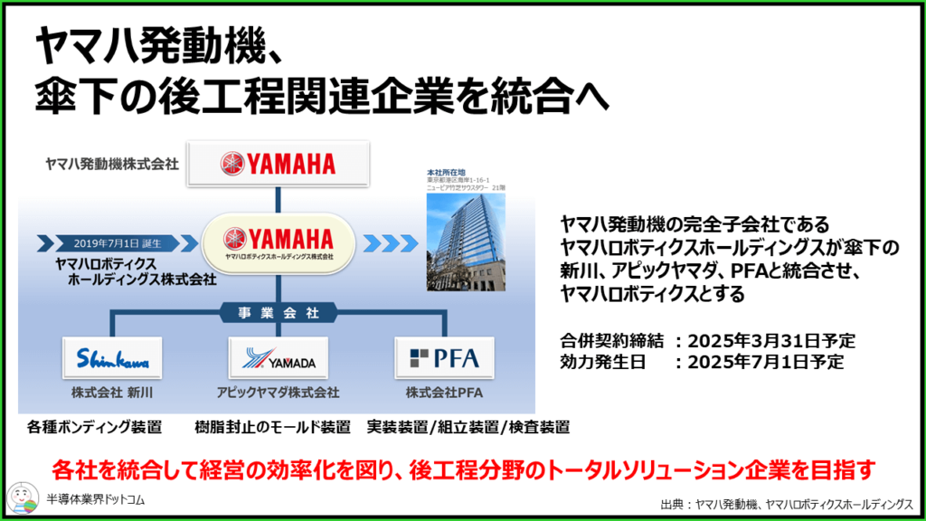 ヤマハ発動機は2/12、同社の完全子会社であるヤマハロボティクスホールディングス、およびその完全子会社である新川、アピックヤマダ、PFAの会社統合を行うと発表しました。