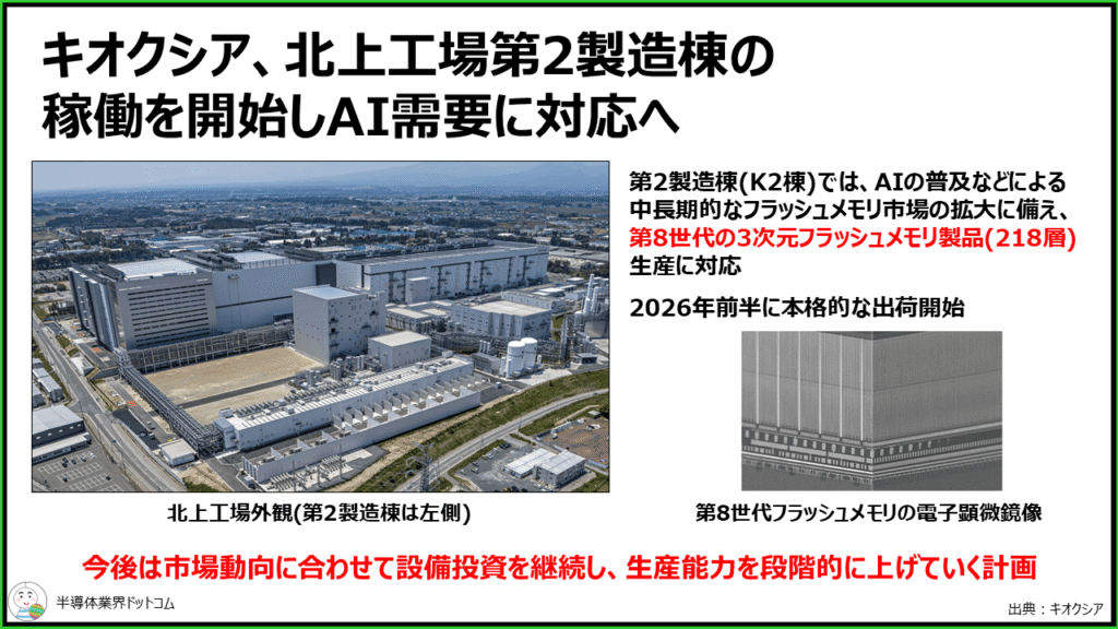 第2製造棟は、AIの普及などによる中長期的なフラッシュメモリ市場の拡大に備えて第8世代3次元フラッシュメモリ製品(218層)や、今後も進化をするフラッシュメモリの生産に対応するとしています。