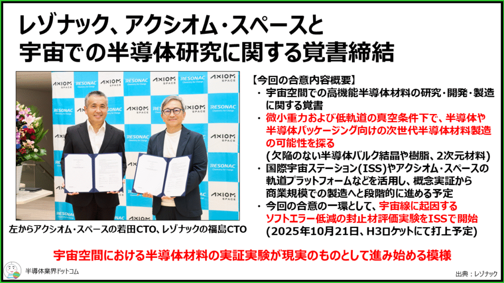 レゾナックは10/1、商業用宇宙インフラ分野をリードする米国のアクシオム・スペースと宇宙空間での高機能半導体材料の研究・開発・製造に関する覚書を締結したと発表しました。