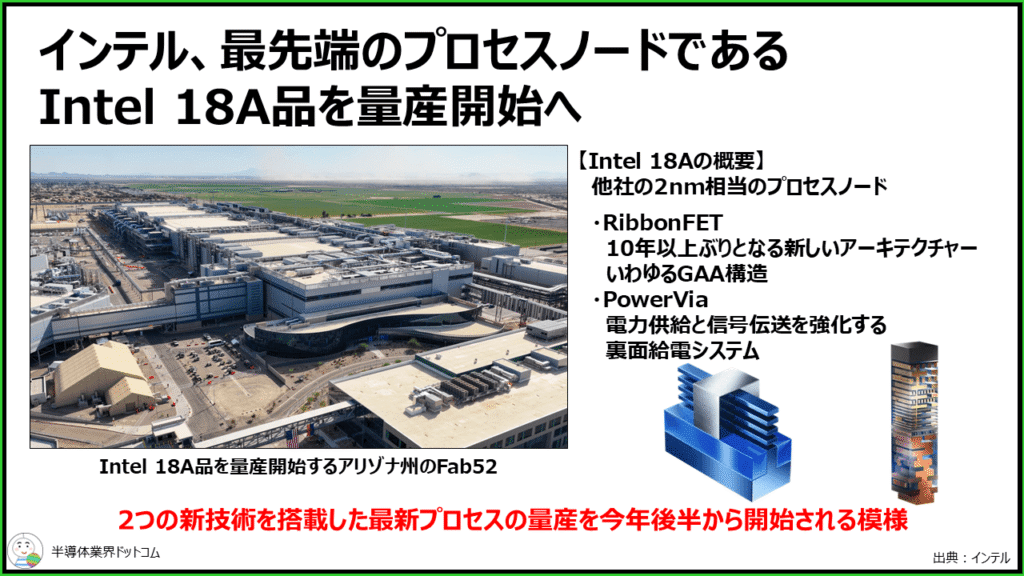 Intel 18Aは米国内で開発・製造される初の2nm相当のプロセスノードであり、RibbonFETとPowerViaという新たな技術が導入されています。