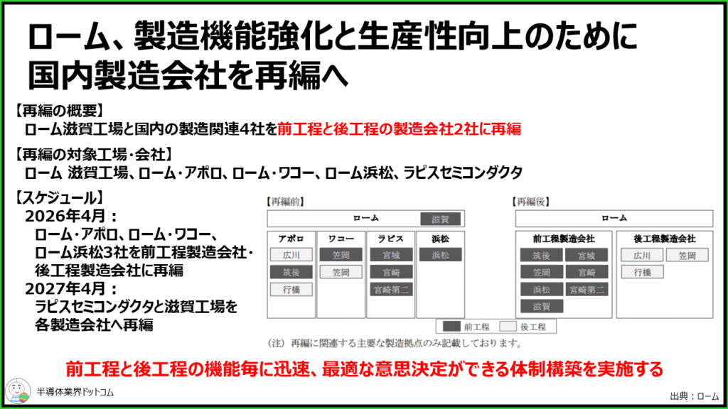 今後のスケジュールとしては、まず2026年4月にローム・アポロ、ローム・ワコー、ローム浜松の3社を前工程製造会社と後工程製造会社の2社に再編します。その後2027年4月にラピスセミコンダクタを各製造会社に再編し、吸収分割によって滋賀工場を前工程製造会社へ承継するというものです。