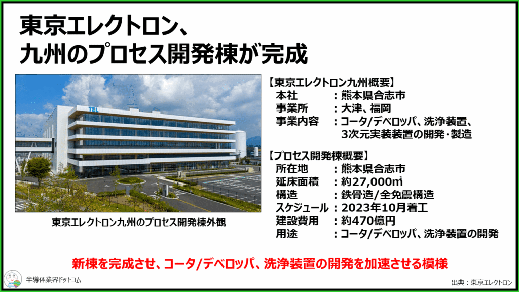 東京エレクトロンが新たな開発棟を完成させたようです。同社が高い市場シェアを持つコータ/デベロッパなどの開発を行うようで、TSMC(JASM)やソニーなどの工場が近くにある九州の地で開発を加速させていくようですね。