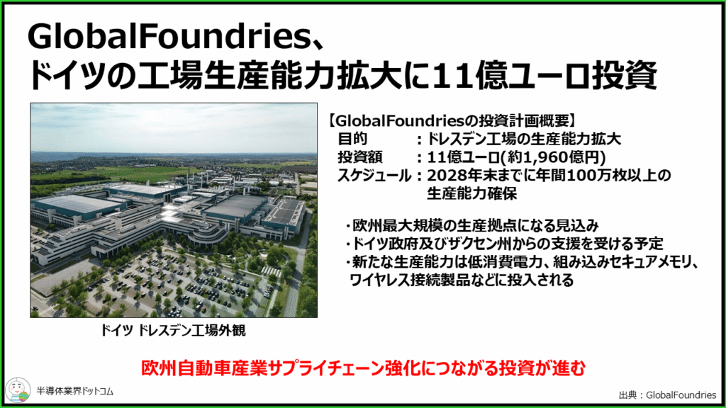 GlobalFoundriesは10/28、ドイツザクセン州ドレスデンの工場の生産能力のために11億ユーロを投資すると発表しました。