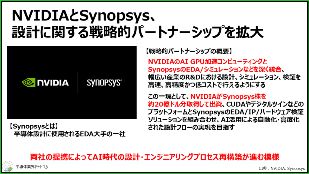 この一環として、NVIDIAがSynopsys株を約20億ドル(1株414.79ドル)分取得して出資し、CUDAやデジタルツイン、物理AIなどのプラットフォームとSynopsysのEDA/IP/ハードウェア検証ソリューションを組み合わせ、AI活用による自動化・高度化された設計フロー(エージェント型AIなど)の実現を目指すとしています。