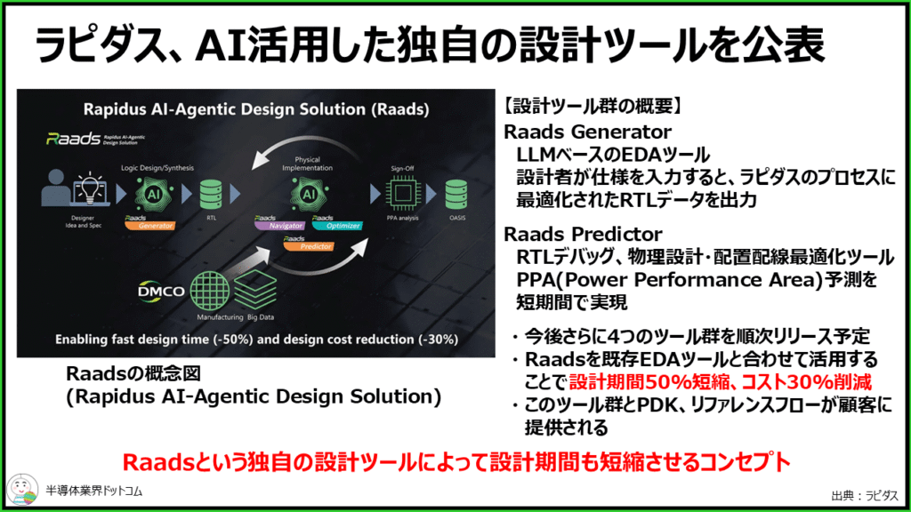 Raadsは同社が提唱するRUMS(Rapidus AI-Agentic Design Solution)を具現化するツール群であり、半導体設計者をAIによってアシスト、さらにRaadsが最先端半導体デバイス設計のAIエージェントとなることを目指すとしています。