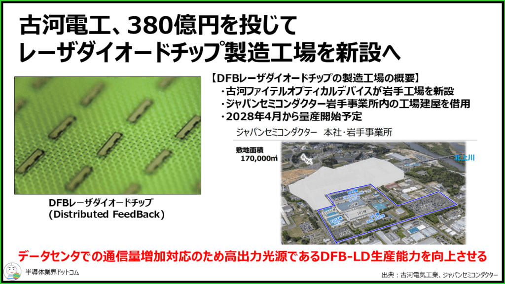 量産開始は2028年4月に予定されています。またタイの工場内にDFBレーザダイオードチップの検査・組立等のための設備を導入するとしています。