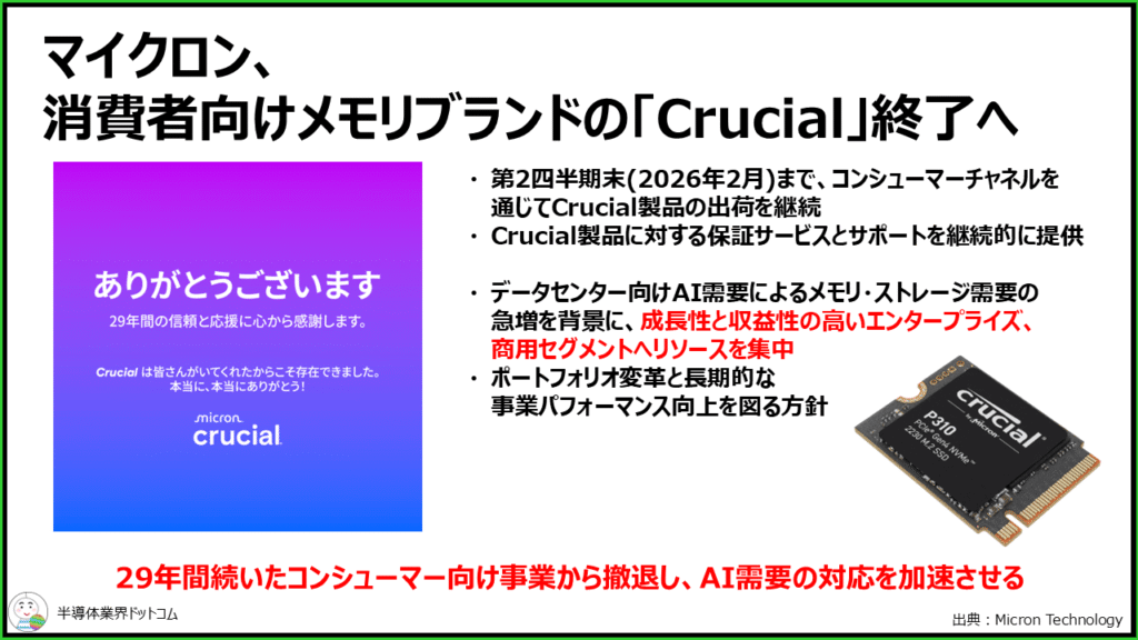 同社は第2四半期末(2026年2月)まで、コンシューマーチャネルを通じてCrucial製品の出荷を継続し、その後も保証サービスとサポートを継続的に提供するとしています。