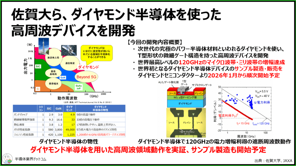 今回は、ダイヤモンド半導体が、マイクロ波帯・ミリ波帯の高周波数においても、世界最高レベルの増幅動作が行えることを実証したもので、2026年1月からはダイヤモンド半導体デバイスのサンプル製造・販売をダイヤモンドセミコンダクターより順次開始する予定ということです。