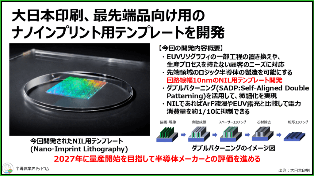 このテンプレートはパターンの密度を2倍にするダブルパターニング(SADP:Self-Aligned Double Patterning)を活用して微細化を実現したということです。今後は半導体メーカーとの評価を進め、2027年の量産開始を目指すとしています。