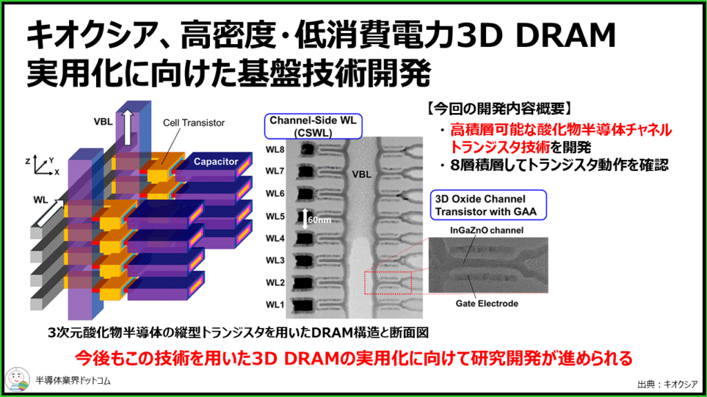 キオクシアは12/12、高密度・低消費電力3D DRAMの実用化に向けた基盤技術として高積層可能な酸化物半導体チャネルトランジスタ技術を開発したと発表しました。