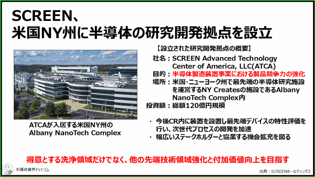 SCREENホールディングスは12/16、半導体製造装置事業における製品競争力の強化を目指して米国ニューヨーク州に研究開発拠点を設立したと発表しました。
