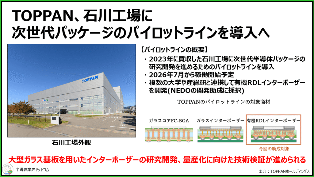 TOPPANホールディングスは12/16、グループ会社のTOPPAN石川工場に次世代半導体パッケージの研究開発を進めるためのパイロットラインを導入し、2026年7月からの稼働開始を目指すと発表しました。