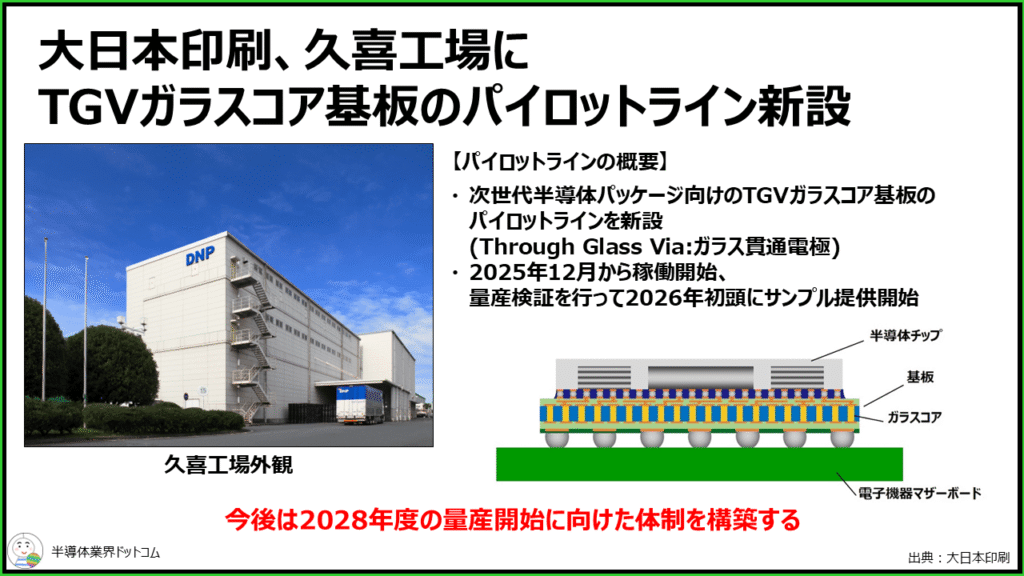 大日本印刷は12/16、久喜工場内に、次世代半導体パッケージ向けのTGV(Through Glass Via:ガラス貫通電極)ガラスコア基板のパイロットラインを新設して2025年12月から稼働を開始したと発表しました。