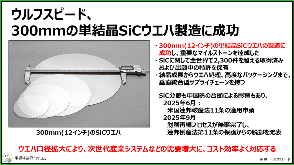 ウルフスピードは2025年6月に米国連邦破産法11条、通称チャプター11の適用申請をしましたが、同年9月に財務再編プロセスが完了しています。今回300mmウエハの製造に成功したということで、これまで積み上げてきた特許などもありますし、今後にも注目したいです。