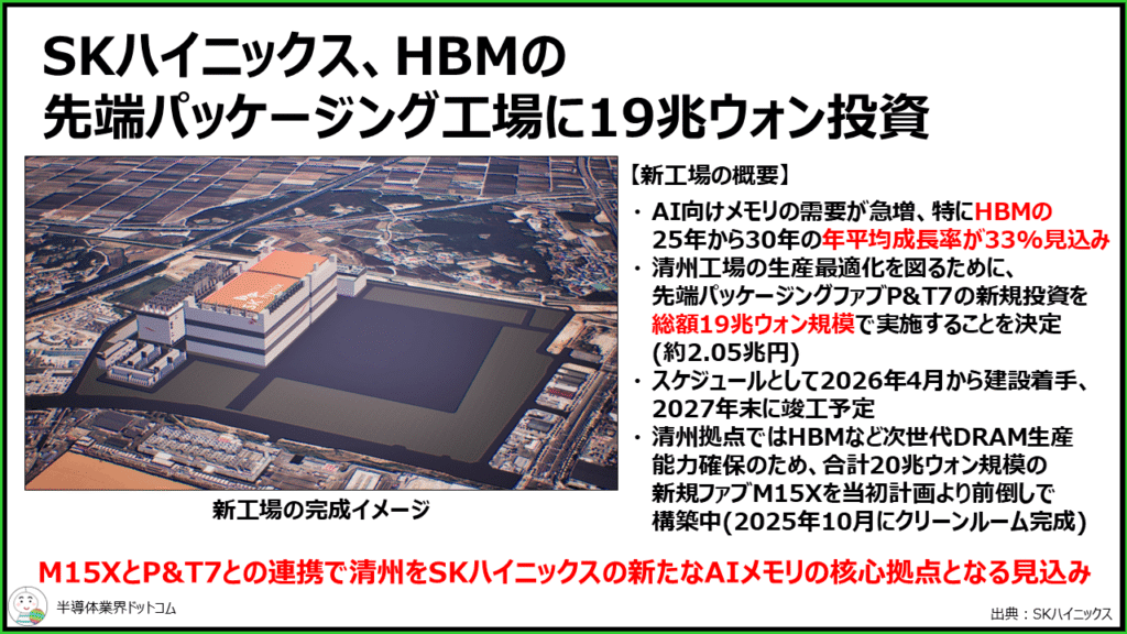 そうした中で同社は、清州工場の生産を最適化するために先端パッケージングファブP&T7を新設することを決定しました。スケジュールとしては2026年4月に建設着手し、2027年末に竣工予定となっています。