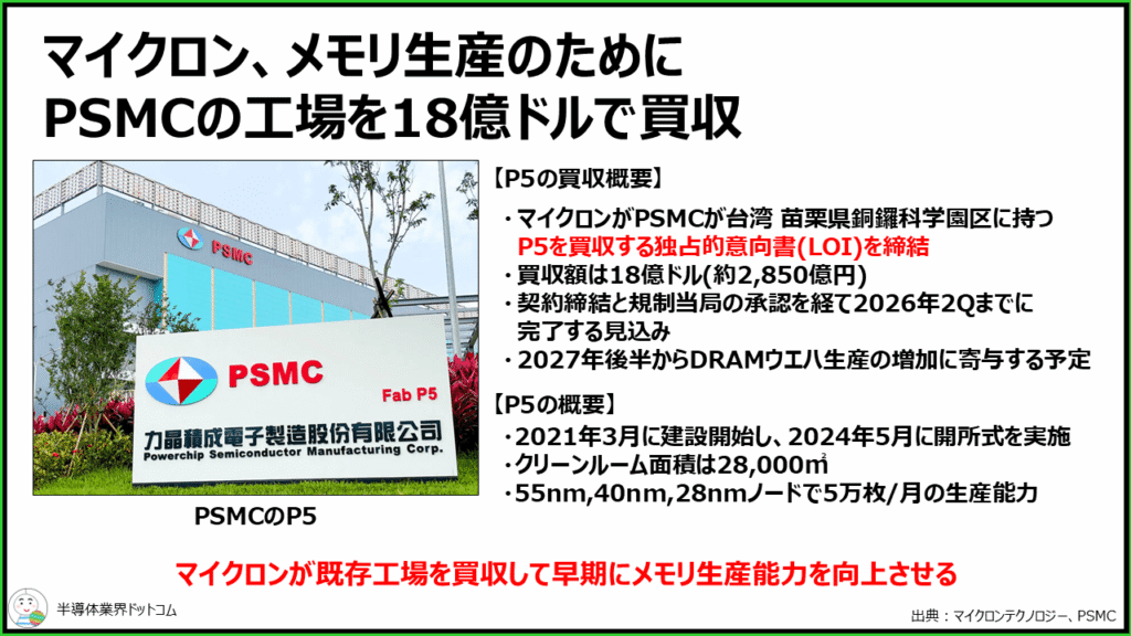 マイクロンテクノロジーは1/17、台湾PSMCの工場であるP5を18億ドル(約2,850億円)で買収する独占的意向書を締結したと発表しました。