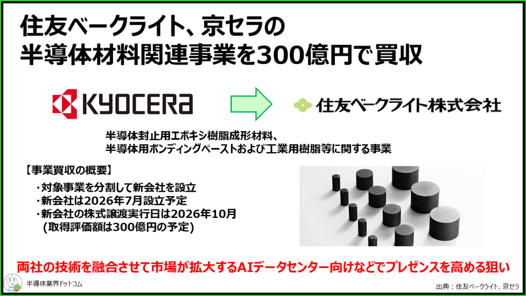 住友ベークライトは1/22、京セラが持つ半導体材料関連事業を300億円で譲り受けると発表しました。