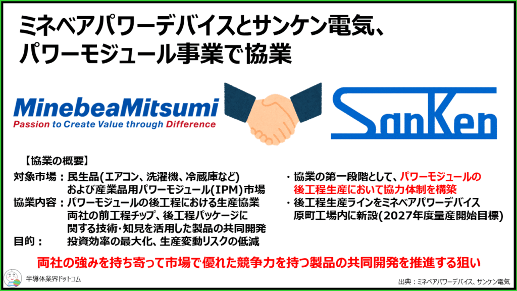 協業の第一段として、後工程生産において協力体制を構築するということで、具体的には後工程の生産ラインをミネベアパワーデバイス原町工場内に新設し、2027年度量産開始目標としています。