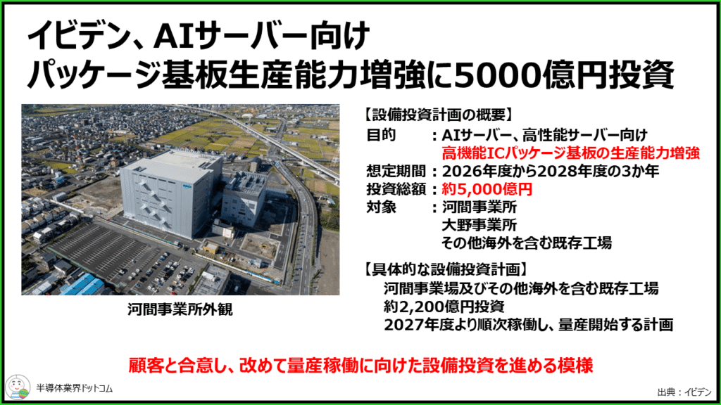 この投資計画の目的は近年需要が増加しています、AIサーバーと高性能サーバー向けの高機能ICパッケージ基板生産能力増強です。対象としては河間事業所、大野事業所、及びその他海外を含む既存工場となっており、3年間で総額約5,000億円を投資するというものです。