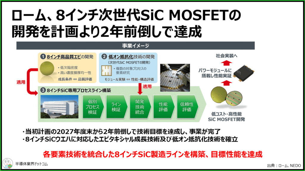 これらの要素技術を確立し、統合した8インチSiC製造ラインの開発に成功、同社の内製モジュールに搭載して性能評価を行った結果、目標性能を達成したということです。