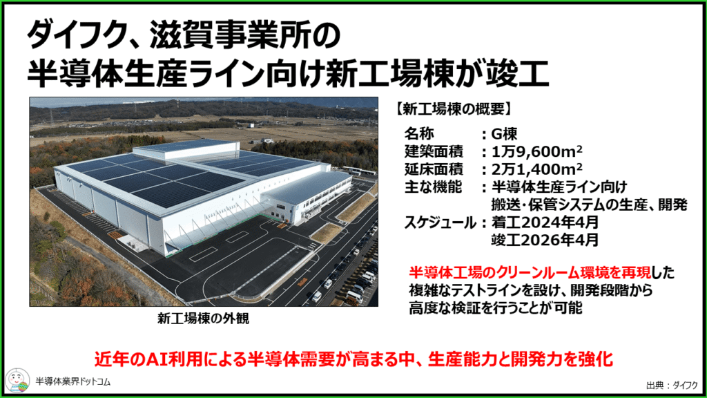 ダイフクは4/3、マザー工場である滋賀事業所で半導体生産ライン向け搬送・保管システムの新たな工場棟を竣工したと発表しました。