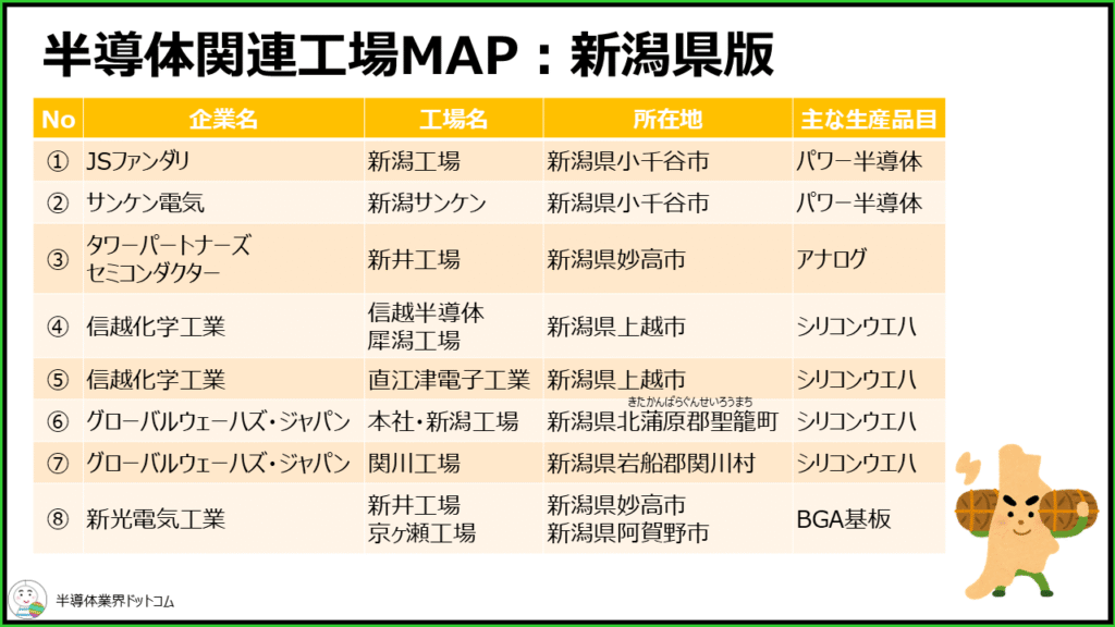 新潟県に立地している主要な半導体関連工場を8つまとめました。