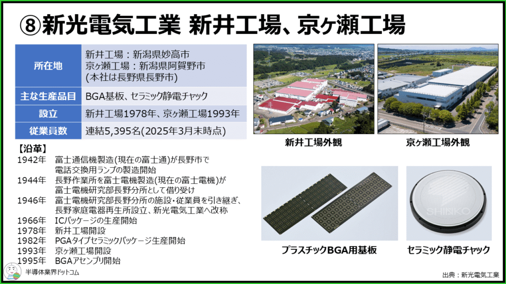 1966年からICパッケージの生産を開始しており、新井工場は1978年に、京ヶ瀬工場は1993年にそれぞれ開設されています。同社は半導体のパッケージ基板分野では世界トップクラスのシェアを持っています。