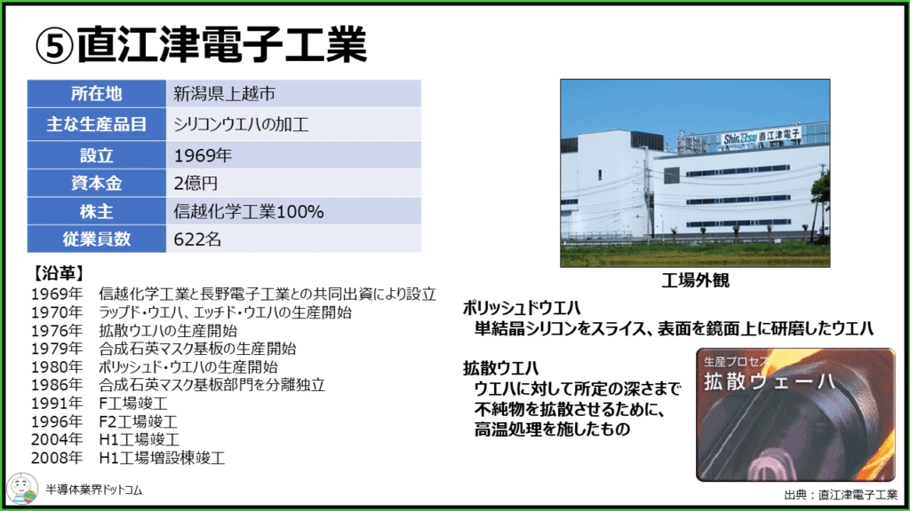 直江津電子工業は信越化学工業の子会社でシリコンウエハの加工を行っています。1969年の設立当時は信越化学工業と長野電子工業との共同出資によって設立されています。そして1970年以降、ポリッシュウエハや拡散ウエハなど、各種ウエハの加工を実施しています。