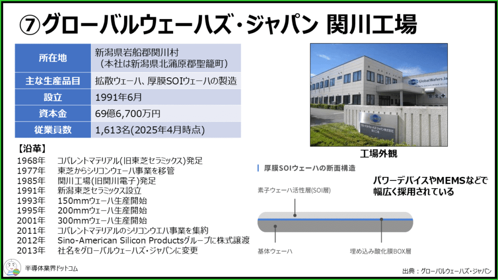 関川工場は、1985年に発足した関川電子が起源となっています。1991 年に社名を関川東芝セラミックスに変更し、その後グローバルウェーハズ・ジャパンの関川工場となっています。