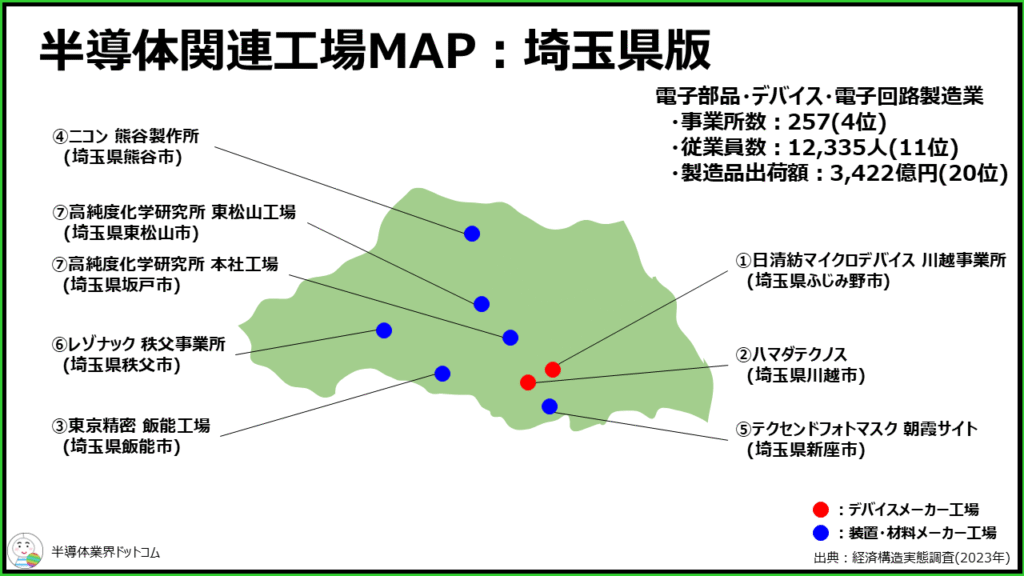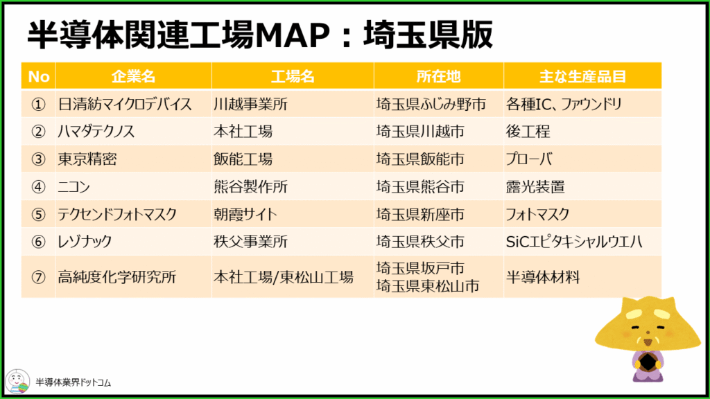 埼玉県に立地している主要な半導体関連工場を7つまとめました。