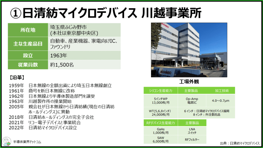 同社は元々、日本無線の出資によって埼玉日本無線として設立され、その後に新日本無線に改称をしています。川越事業所は新日本無線時代の1963年に操業を開始しています。