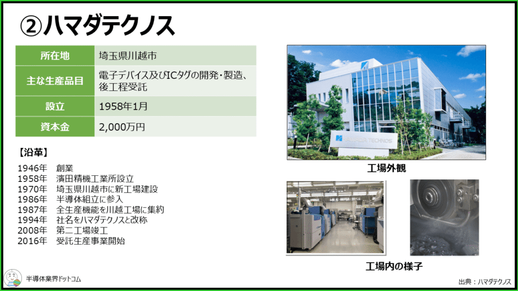創業は1946年で、1958年に濱田精機工業所が設立されています。1986年から半導体の組立に参入し、1994年に社名を現在のハマダテクノスに変更しています。受託加工事業は2016年から開始しているようです。