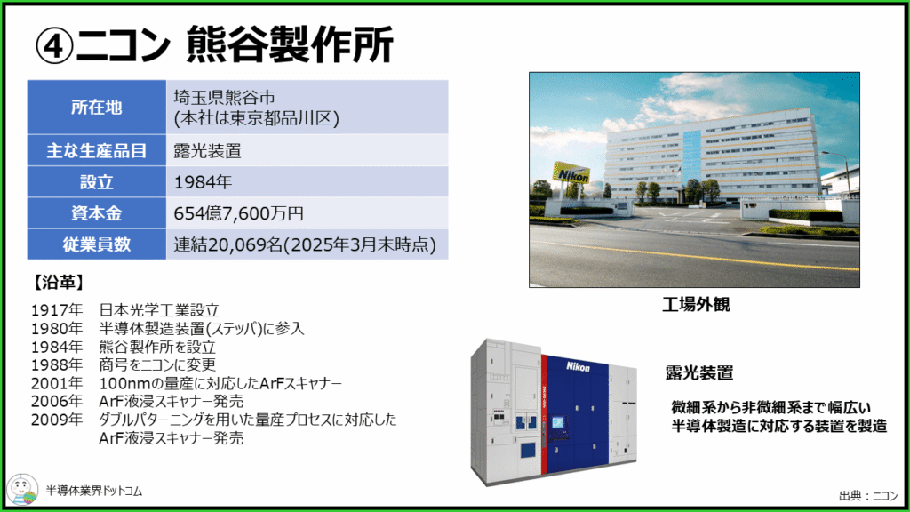 同社は1917年に日本光学工業として設立されています。1980年からは、ステッパなどの半導体製造装置事業に参入、熊谷製作所は1984年に設立されています。そして1988年には社名を現在のニコンに変更しています。