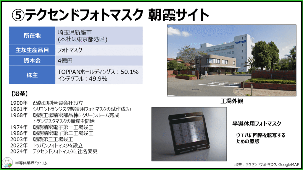 同社は元々、凸版印刷のフォトマスク事業であり、2022年にTOPPANホールディングス(旧凸版印刷)から会社分割によってトッパンフォトマスクとして設立され、2024年11月に現在のテクセンドフォトマスクへ社名変更をしました。