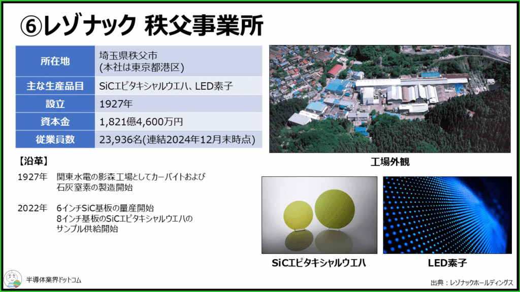工場の歴史は古く、1927年に関東水電の影森工場としてカーバイトや石灰窒素の製造が開始されています。その後の詳しい経緯は不明ですが、2022年から6インチのSiC基板の量産が開始され、さらに8インチ基板のSiCエピタキシャルウエハのサンプル供給も開始しています。
