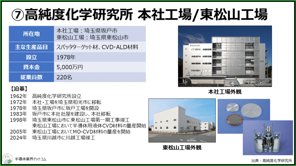 高純度化学研究所は本社工場が埼玉県坂戸市に、東松山工場が埼玉県東松山市にあります。