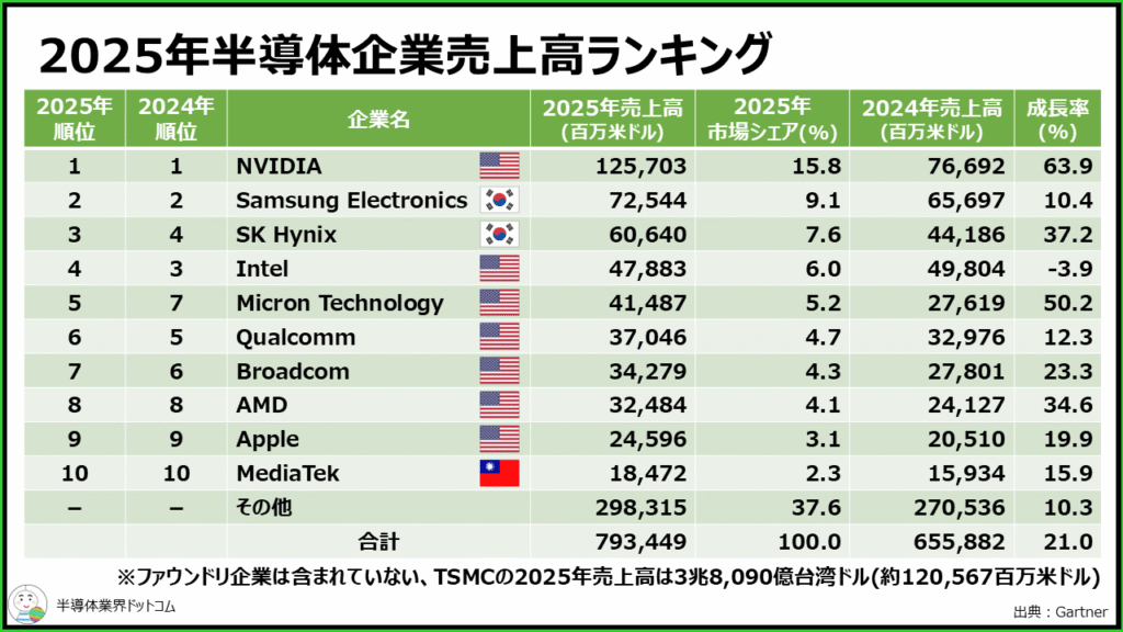 また、このランキングにはファウンドリ企業は入っていません。ファウンドリ企業トップのTSMCの2025年売上高は3兆8,090億台湾ドルで、米ドルに換算しますとおよそ120,567百万ドルとなり、NVIDIAに次いで2位に入る売上高を誇ります。