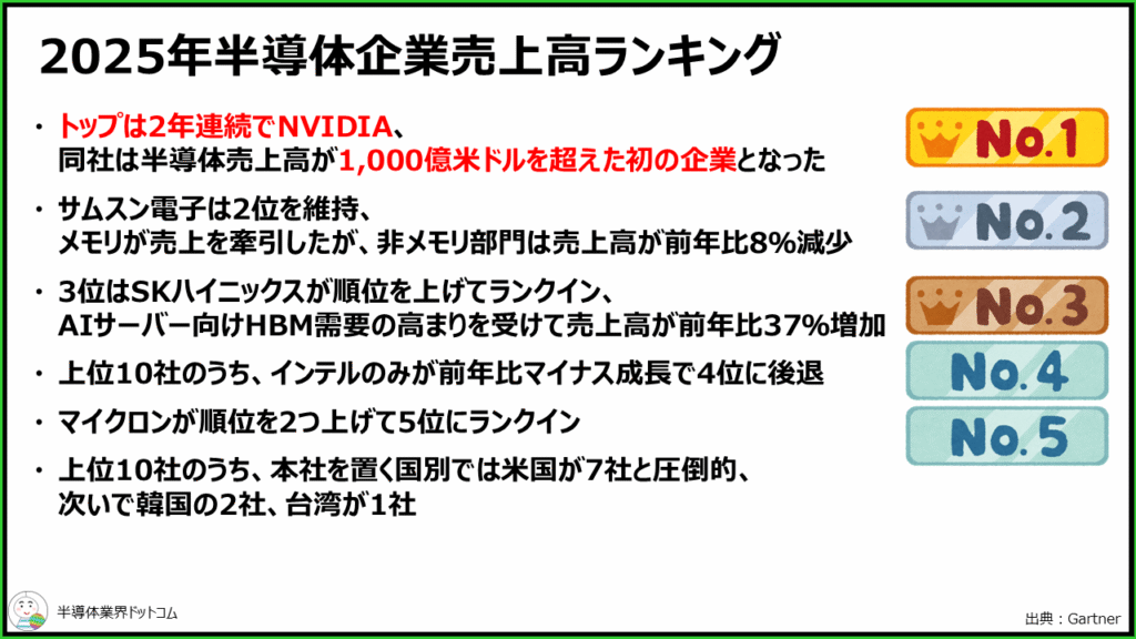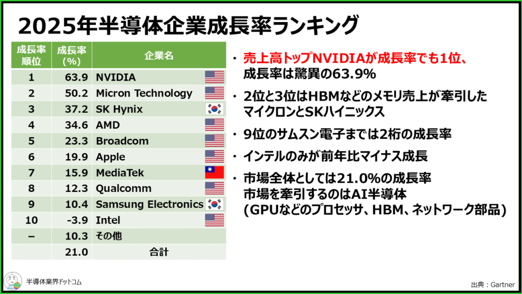 また、市場全体では前年比21.0%の成長率ということで、2025年は市場が大きく拡大した1年だったと言えます。これを牽引しているのはAI関連の半導体で、GPUなどのプロセッサやHBM、ネットワーク部品です。これらを作る企業が上位にランクインしています。