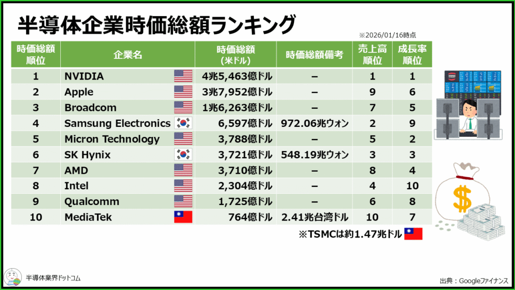 2位はApple、3位はブロードコムとここまでが1兆ドルを超える時価総額を誇ります。またTSMCも時価総額は1.47兆ドルとなっていますので、1兆ドルクラブの1社です。
