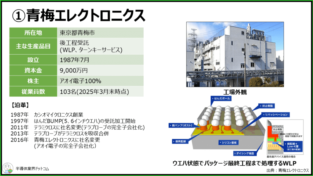 その後、2011年に半導体のテストを主要事業とするテラプローブの完全子会社となり、テラミクロスに社名変更をしています。そして2013年にテラプローブに吸収合併されましたが、2016年にウエハレベルパッケージ部門を分離して青梅エレクトロニクスが設立され、国内大手のOSATであるアオイ電子に売却されました。そのため、現在はアオイ電子の完全子会社となっています。