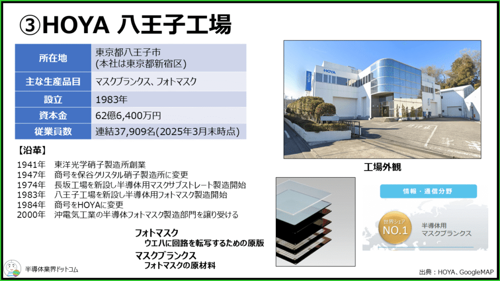 同社は光学機器、ガラスメーカーで1941年に東洋光学硝子製造所として創業されました。1974年、山梨県に長坂工場を新設して、半導体用のマスクサブストレートの製造を開始しています。八王子工場は1983年に設置され、ここでは半導体用のフォトマスク製造が行われています。そして1984年に商号が現在のHOYAに変更されています。